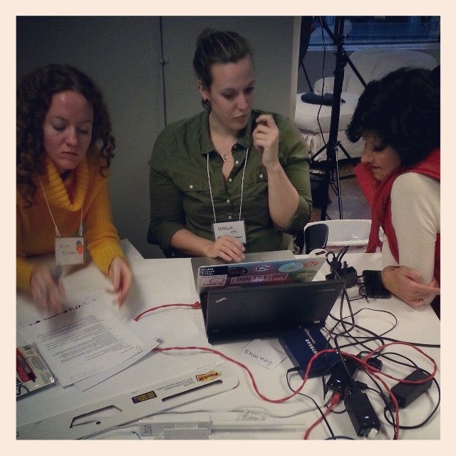 Kristin Williams(左)和 Katrin Verclas(右)与我(中)一起为 Commotion 网站和路由器平台制定人物角色和信息层级。图片来源:Preston Rhea,Commotion 团队,开放技术研究所