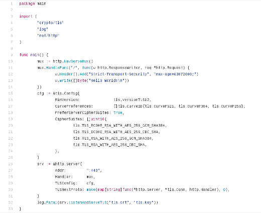 代码创建了一个 mux,是 HTTP 请求多路复用器的缩写。这个 mux 有一个函数,可以创建一个带有标头和内容(Hello World!)的 HTTP 服务器。cfg 引入了您在可靠的 NGINX 或 httpd 配置中看到的所有 TLS 位和片段。srv 将各个部分组合在一起,并定义要侦听的端口。行 log.Fatal(srv.ListenAndServeTLS("tls.crt", "tls.key")) 定义了要使用的证书文件,如果它们无效,则记录致命错误。
