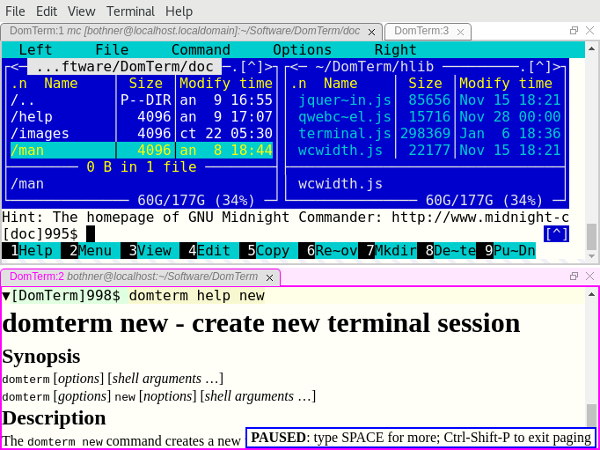 输出中的富文本: 帮助消息通过 HTML 样式更具可读性并且看起来更好。 图片 1 的下部窗格显示了 domterm help 的输出。 (如果不在 DomTerm 下运行,则输出为纯文本。)请注意来自内置分页器的 PAUSED 消息。