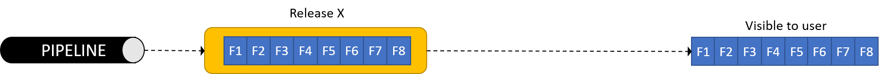 在这里,我们有一个 X 版本和八个功能,它们都被部署并暴露给耐心等待的用户。我们不断地交付价值——但是,由于典型的发布节奏为六个月到两年,随着世界继续前进,功能的价值会下降。当有时间计划并且对响应更迫切的需求的期望较低时,它工作得还不错。