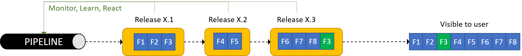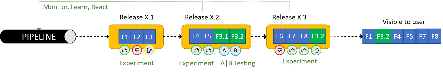 当我们部署每个功能时,我们可以观察用户行为和反馈,并证明或证伪推动部署的假设。正如您所看到的,功能 2 和 6 的实验失败了,这使我们能够快速失败并将它们从解决方案中删除。我们不希望携带不交付价值或不让用户满意的浪费! 功能 3 的实验尚无定论,因此我们调整了功能,重复实验,并在 X.2 版本中执行 A/B 测试。根据观察,我们将变体功能 3.2 确定为获胜者,并在 X.3 版本中重新部署。我们只暴露通过实验并让用户满意的功能。