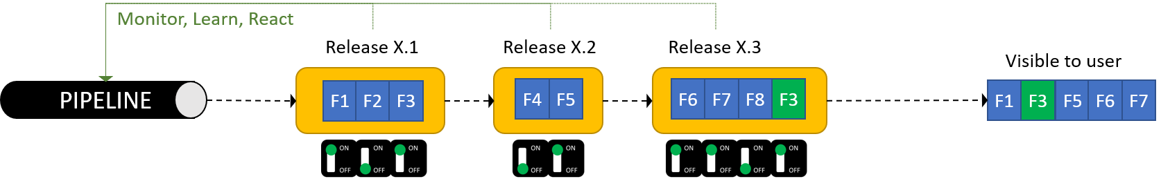 使用部署环和/或功能标志,我们可以将发布部署和功能暴露解耦,细化到单个用户,以控制功能的暴露范围——爆炸半径。我们可以进行实验;逐步暴露、测试、启用和隐藏功能;微调版本,并根据学习和反馈不断调整方向。