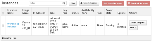 接下来,让我们启动一个虚拟机实例,在其上运行我们的初始 WordPress 安装。在左侧导航栏的“计算”选项卡下,单击“实例”。我将使用 Fedora 20,因为这是我最熟悉的,但如果您更喜欢其他发行版,请随意尝试其他发行版。除了 Fedora 20 之外,TryStack 还提供 CentOS 6.5 和 7 以及 Ubuntu 13.10 的镜像。我将把我们的实例名称命名为“WordPress Instance”,没有创意。从“启动源”下拉列表中,选择“从镜像启动”,然后选择您选择的发行版。