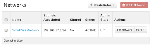 让我们首先创建一个私有网络来连接我们的实例。使用左侧导航栏,单击网络部分下的“网络”,然后单击右上角的“创建网络”按钮。我们将我们的网络命名为“WordPressNetwork”,但在这种测试配置中,您将其命名为什么并不重要。单击“下一步”,在“子网”下,您需要为网络定义一个子网以供使用。我不是网络专家,所以我只是采用了 Dan 视频中提供的默认设置 192.168.37.0/24 作为网络地址。所有其他字段都可以保留其默认设置。再次单击“下一步”。在这里,您需要确保添加 DNS 服务器,以便您的实例可以解析域名。我第一次尝试设置网络时,不小心跳过了这一步,并且花了一段时间试图弄清楚为什么我可以 ping 通 IP 地址,但(似乎)无法执行任何其他需要外部 Internet 连接的操作。您可以在 DNS 名称服务器框中使用 Google 的 8.8.8.8 服务器,然后单击“创建”以创建您的内部网络。然后,您的网络应如下所示。