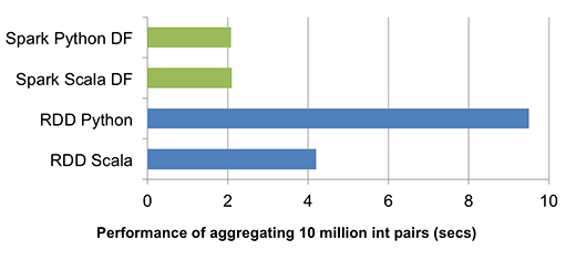 上图比较了在单台机器上对 1000 万个整数对运行分组聚合的运行时性能(源代码)。 由于 Scala 和 Python DataFrame 操作都被编译成 JVM 字节码以供执行,因此两种语言之间几乎没有区别,并且都比 vanilla Python RDD 变体快五倍,比 Scala RDD 变体快两倍。