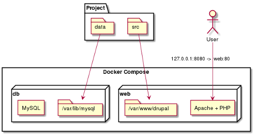 Drupal 的源代码被放置在“/src”中并发送到 Apache 容器。这是卷的原理:主机上的本地目录或文件可以附加到一个或多个容器中的特定目录。然后,您对 MySQL 存储目录执行相同的操作,以便不会丢失保存到数据库的记录。