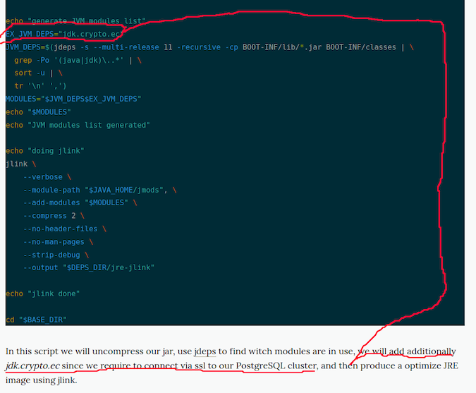 哈!想象一下,他的脚本正在创建一个自定义 Java 运行时,就像我的脚本一样。但他说他需要手动添加模块 jdk.crypto.ec 才能通过 SSL 连接到他的 PostgreSQL 环境。听起来确实很熟悉。