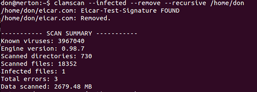 我个人最喜欢的是 clamscan --infected --remove --recursive /home,它会递归扫描我的主目录并打印出受感染的文件。
