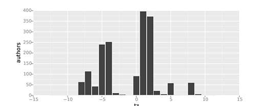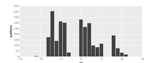 时区分析的一个例子。它显示了 2014 年 OpenStack 每个时区的 Git 作者数量。CC BY-SA 4.0。