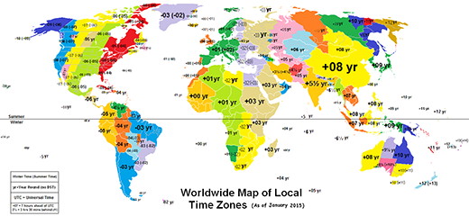 世界时区地图。作者:Phoenix B 1of3。CC BY-SA 3.0。