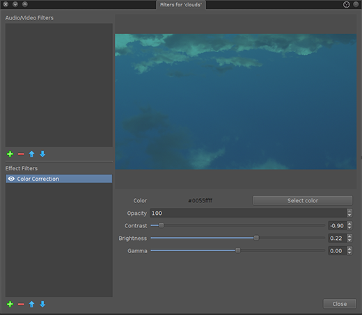 可以将过滤器添加到整个场景或单个来源。要添加过滤器,请右键单击场景或来源,然后选择 **过滤器**。在出现的过滤器窗口中,添加音频或视频过滤器或视频效果。效果还不能进行关键帧处理,因此它们会影响整个剪辑。