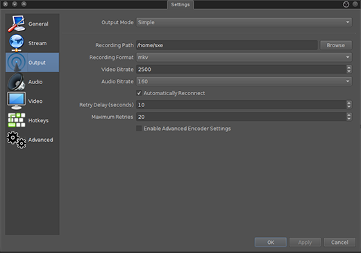在出现的 **设置** 窗口中,从左侧栏中选择 **输出**。你使用的设置取决于你,并将取决于所有常见因素:你希望你的文件占用多少空间?你正在寻找什么样的质量?首先你捕获的是什么样的质量?