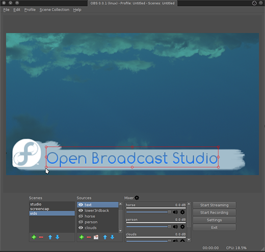 文本和静态图像也是可接受的输入格式,因此标准的下三分之一很容易拼凑起来。添加文本作为 **文本 (Freetype2) 来源**,并添加一个在 GIMP 中创建的文本背景。通常,*带有* Alpha 通道的 PNG 文件是最好的。