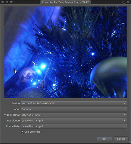 将来源添加到场景后,它将成为显示的来源。根据你使用的摄像头类型和你的预期目的地,输入和输出之间可能存在断开连接。如果是这种情况,请根据需要缩放图像,使其适合你的屏幕。