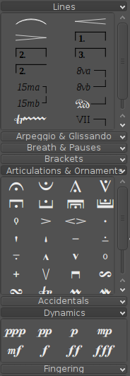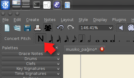 如果你刚开始,可以使用鼠标输入音符。它的工作方式正如你所期望的那样;选择一个音符,指向你想要放置在五线谱上的位置,然后单击。重复上述步骤。有工具栏、调色板和菜单,可让你访问你可能想要输入到乐谱中的每个小细节。