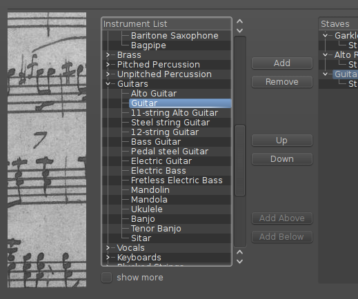 使用的通用 MIDI (GM) 音色由声部列表确定。要访问声部列表,请从显示菜单中选择混音器。在声部列表(混音器)窗口中,你可以设置乐谱中每个声部的基线音量,以及立体声位置、混响级别和合唱效果。你还可以重命名声部,并设置使用的 GM 音色。