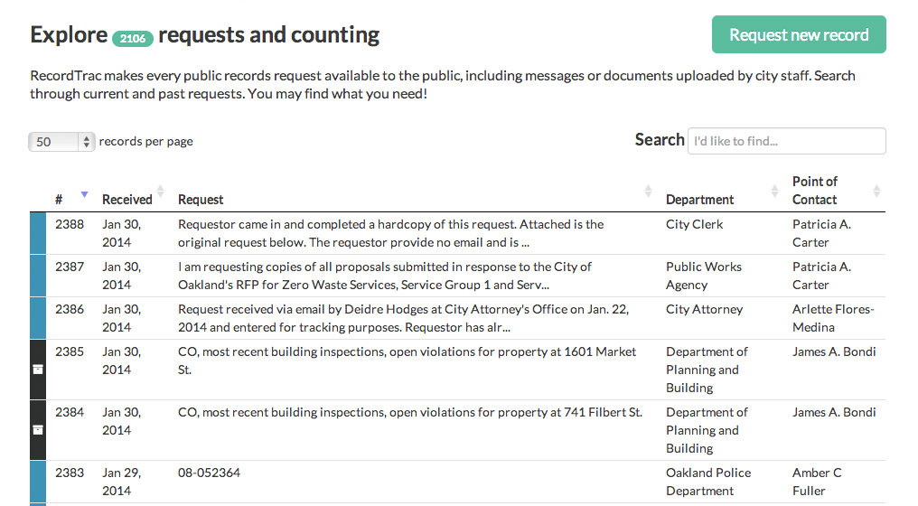 RecordTrac 充当公共记录的不断增长的存储库。请求者可以搜索该站点,查看他们想要的信息是否已存在,从而消除重复请求并节省大家的时间。关于请求的全面数据可以塑造政策,指导默认情况下在开放数据门户上公开哪些信息。关于请求的详细数据使公众能够通过分析机构绩效来监督政府,以确保所有请求者都得到平等对待。