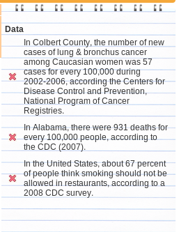在演示过程中,Caburnay 的同事举了一个例子,说明了关于餐厅禁烟令的重要性、二手烟在餐厅的相对安全性以及过滤器的使用方面的争论。他把自己想象成一名报道这个故事的记者,他推测自己会想要关于癌症和吸烟的本地数据,但在过去,这些信息从哪里来?又如何融入记者的日程安排中呢?