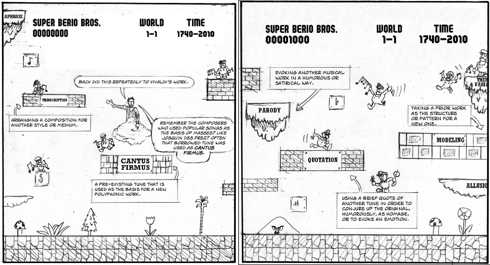 音乐借用,许多音乐都依赖于此,类似于混音,但它比 九寸钉乐队 要古老得多。勃拉姆斯的《第一交响曲》被指挥家汉斯·冯·彪罗描述为“贝多芬第十交响曲”,因为它不仅在音乐上相似,而且在主题上也与贝多芬的作品相似。勃拉姆斯将此理解为剽窃指控,但实际上他很清楚有意的相似之处。