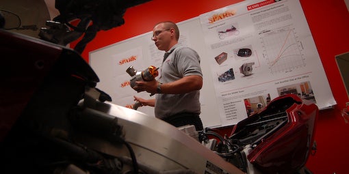 在今天的开放日上,许多学生——都是本科生——展示了他们的项目,并谈论了他们正在做的事情。 Andrew Misenheimer 展示了他团队的 SPARK 项目,这是一个电动增压器的原型,旨在提供一种更便宜、更安全的替代方案,可以在不增加重量的情况下为摩托车提供更多动力。 Alpha 原型将从通常产生 98 马力的发动机中获得 120 马力,而 Beta 原型将获得 160 马力。