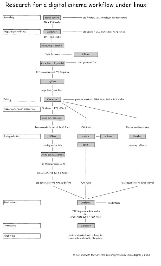我当时进行的研究源于这种需求:在使用 Linux 中的 DV 和 HDV 视频编辑技术建立之后,仅使用自由软件工具拍摄和完成一部短片。因此,它考虑超越全高清,达到数字电影的标准 - 以高于 2K 的分辨率记录 RAW、逐行扫描和更大的帧。