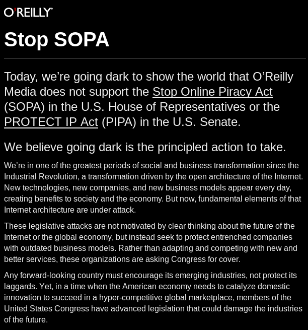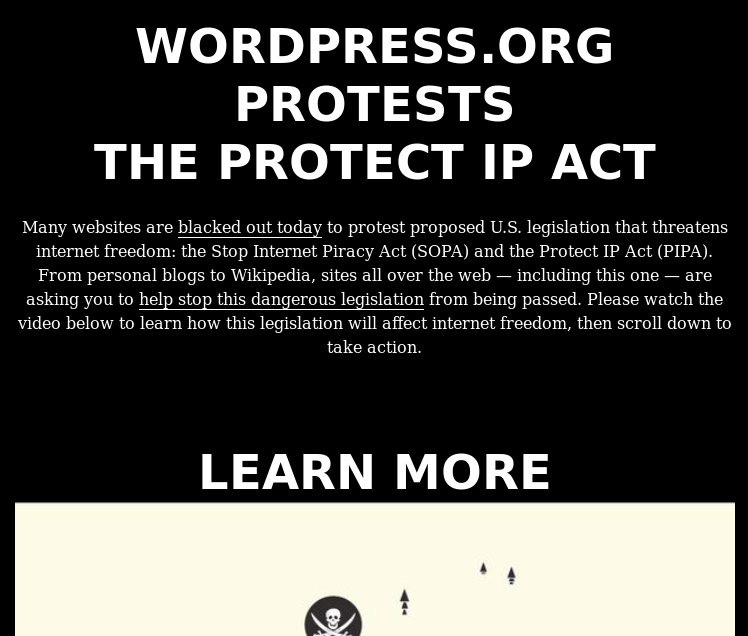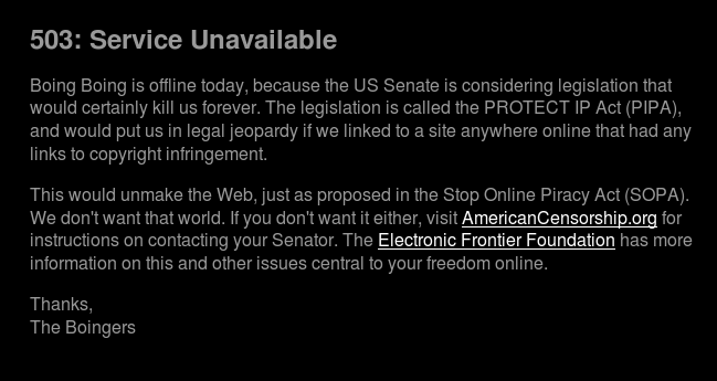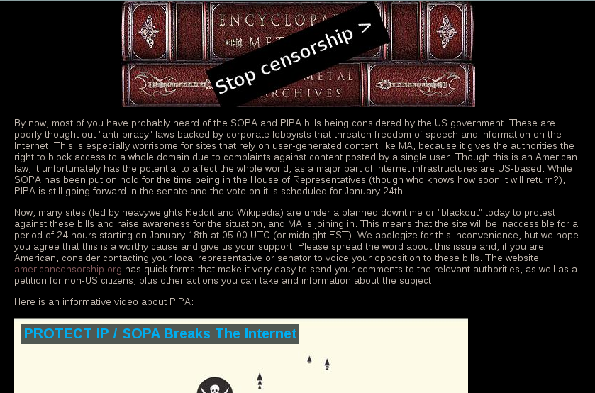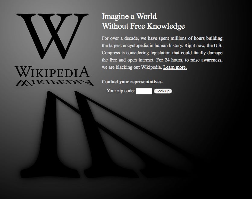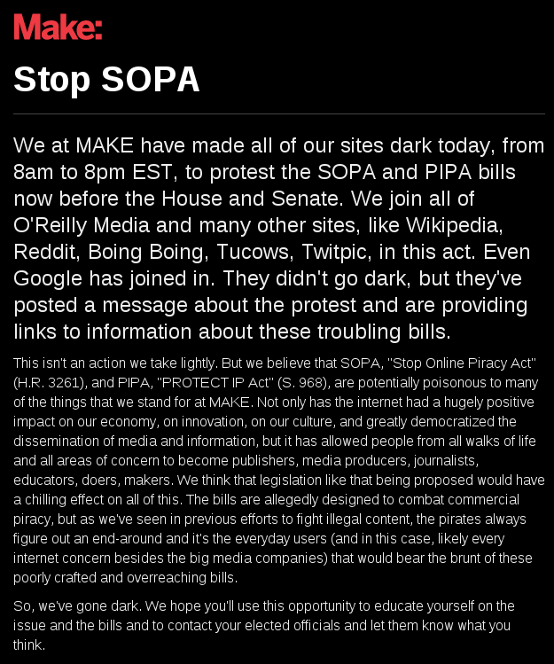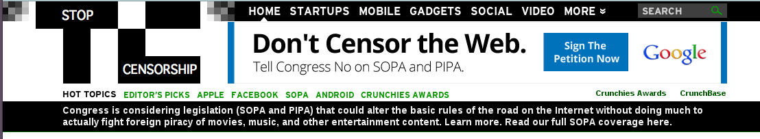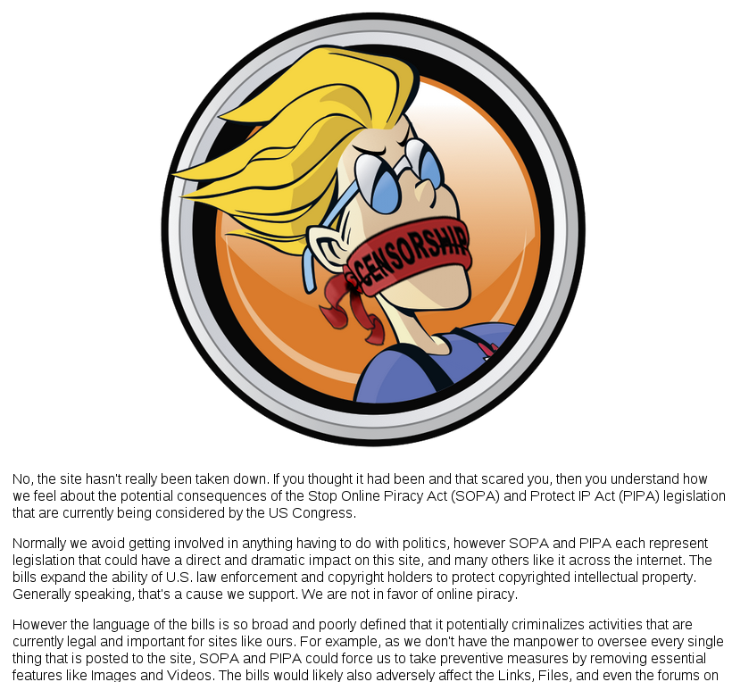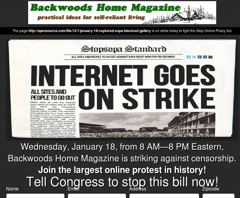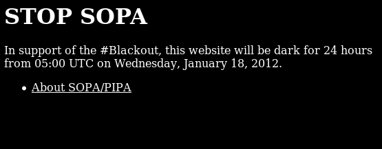 我将在今天持续更新这篇文章,添加更多加入 SOPA 遮 blackout 的网站图片。请在评论中留下您希望添加到画廊的任何网站,画廊将在遮 blackout 结束后保留在此处。另请注意,这些是“首屏”截图——如果您有完整页面截图,请随时发送,我也会尽力在今天结束前尽可能多地获取这些截图。