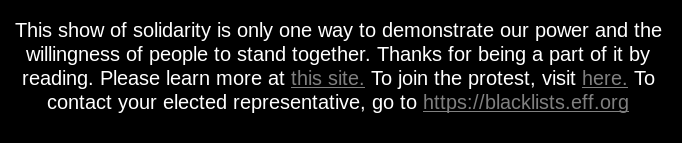 这种团结的展示只是证明我们的力量和人们团结意愿的一种方式。感谢您的阅读,成为其中的一部分。请访问 此网站 了解更多信息。要加入抗议,请访问 此处。要联系您选出的代表,请访问 https://blacklists.eff.org