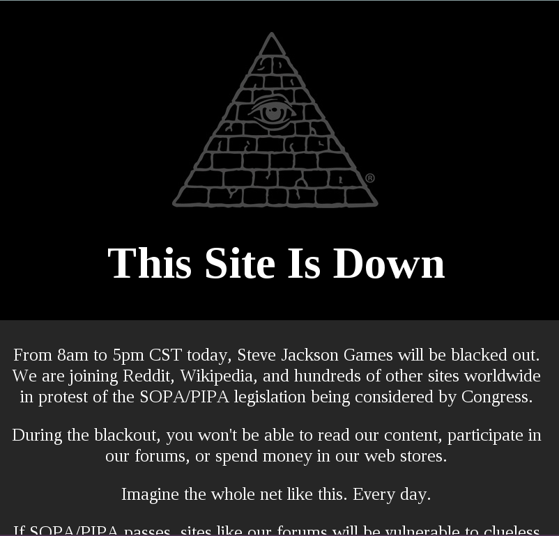 2600 无法访问。我们已加入 24 小时的黑暗行动,以抗议 SOPA 和 PIPA 等法案。此类法案可能会使像我们这样的网站永久陷入黑暗。您可能听说过战斗已经胜利,SOPA 和 PIPA 没有通过的机会。不要被误导。