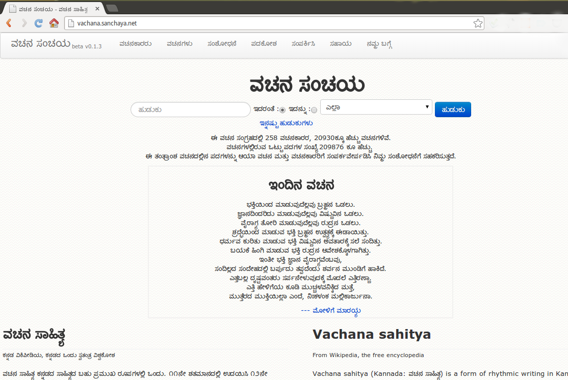 目前,我们的存储库 Vachana Sanchaya 拥有大约 200,000 个独特的单词,这些单词来源于这些诗歌。公众一直在使用我们的存储库,并通过我们的 Facebook、Twitter 和 Google+ 个人资料访问 Vahanas(诗歌)。现在有成千上万的人每天将阅读 Vahana 作为他们日常生活的一部分。Vachana Sanchaya 不仅用于阅读诗歌,也用于研究。因此,我们添加了一种方法,供研究人员帮助我们审查内容,并将添加来自各种研究论文的参考文献。