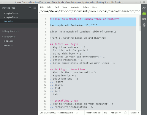 Atom 还不错,但足够令人恼火,所以我决定尝试 Adobe 开源文本编辑器 Brackets。Brackets 渲染 AsciiDoc 的效果更好,虽然打开 AsciiDoc 文件仍然不是无缝的,但它比 Atom 更好。我希望 Brackets 具有运行拼写检查功能,而不是在完成后运行拼写检查的功能,但它可以预览我需要看到的内容,并为我提供运行字数统计,所以我很满意。