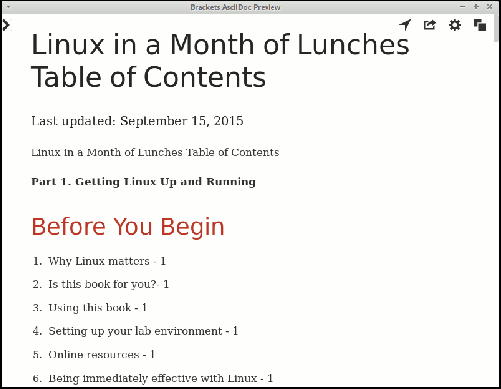 Brackets 和 Atom 在 HTML 中渲染,但 a2x 命令(它是 AsciiDoc 包的一部分)使将 .adoc 文件转换为 PDF 变得容易(尽管当图像文件名中包含句点时,会导致转换失败的错误)。输出看起来像专业的格式化书籍章节。