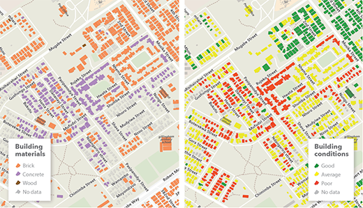 社区讨论和基线调查促成了关于在社区地图绘制活动期间收集哪些细节的指导性决策。Dzivarasekwa 的志愿者调查了超过 7 平方公里内的 8,000 多栋建筑物。下图显示了地图绘制的其中一项成果。结果显示,住房质量与建筑材料类型之间存在关联,混凝土房屋的状况比砖房更差。当结合起来时,这些数据提供了最容易遭受洪水等灾害影响的居民的位置,从而更容易规划未来的减灾活动。津巴布韦红十字会现在可以根据调查和地图结果,计划为被视为高优先级的地区提供服务,并有针对性地帮助需要立即帮助的特定家庭。现在有了包括房屋地址在内的详细信息,流程效率大大提高。