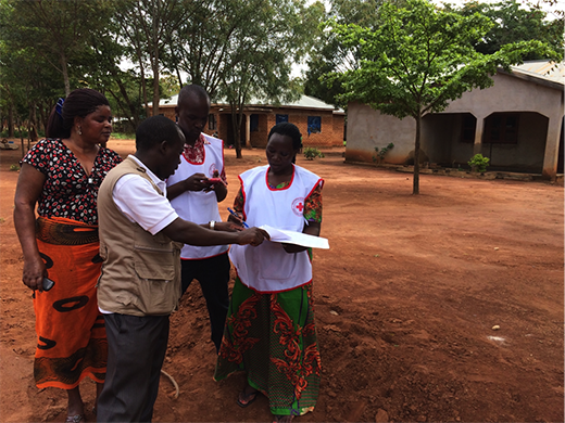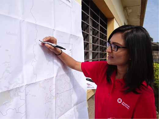 志愿者使用 Field Papers 和 GPS 收集当地数据,这些数据将用于项目并添加到 OpenStreetMap 中。版权所有:美国红十字会。