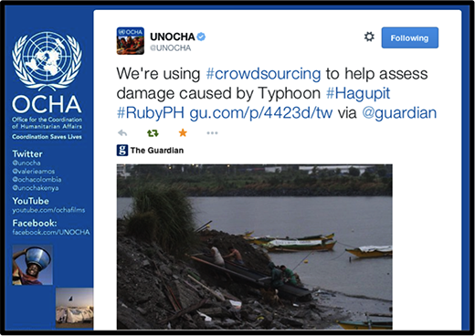 最初是高端 5 级飓风,“红宝石” 台风在 2014 年 12 月向西快速移动,直接冲向菲律宾,因此联合国人道主义事务协调厅(UN/OCHA)启动了数字人道主义网络(DHN)。DHN 是已建立的人道主义组织与来自世界各地的精通技术的数字志愿者团体之间的官方接口。这些数字人道主义者通过理解重大灾难期间产生的大数据(如卫星图像数据和社交媒体信息)来帮助地面工作人员。这两种数据源都可用于快速评估灾害损失和由此产生的需求。