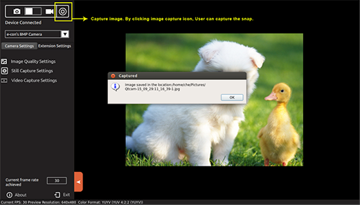 默认情况下,QtCAM 将以静态图像捕获模式打开;单击摄像头图标也会将其切换到静态图像捕获模式。要捕获静态图像,请单击捕获图像图标或预览。然后,图像将保存在静态图像捕获设置菜单下可用的图像位置中选择的目录路径中。