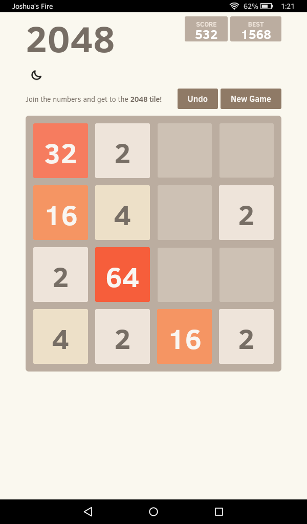 2048 益智游戏的实现。该游戏涉及在 4x4 网格上移动带有数字的方块。方块最初带有数字 2,每次两个匹配的方块接触时,它们就会合并。数字 2 的方块接触数字 2 的方块会变成数字 4 的方块,两个数字 4 的方块接触会变成数字 8 的方块,依此类推。目标是不断合并方块以形成数字 2048 的方块,但如果网格被方块填满且没有有效的移动剩余,则游戏结束。