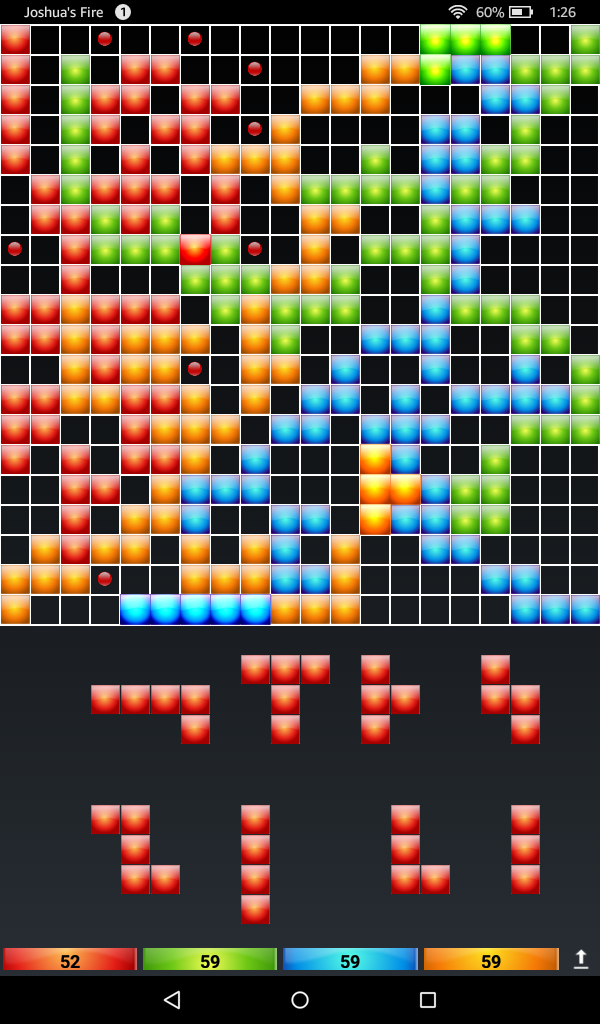 Blokish 是 Blokus 棋盘游戏的非官方数字版本。游戏在 20x20 的网格上进行,四名玩家(在单人游戏中,电脑扮演所有三个对手)轮流将他们的游戏棋子放在网格上。每位玩家有 21 个不同形状和大小的棋子,范围从单个正方形到排列成各种形状的五个正方形的棋子。玩家放在棋盘上的第一块棋子需要接触棋盘的角,并且随后的每块棋子都需要接触玩家已经放在棋盘上的棋子的角,但它不能接触相同颜色的棋子的边。目标是尽可能多地用完棋子,并覆盖比其他玩家更多的网格点,同时试图阻止其他玩家实现相同的目标。