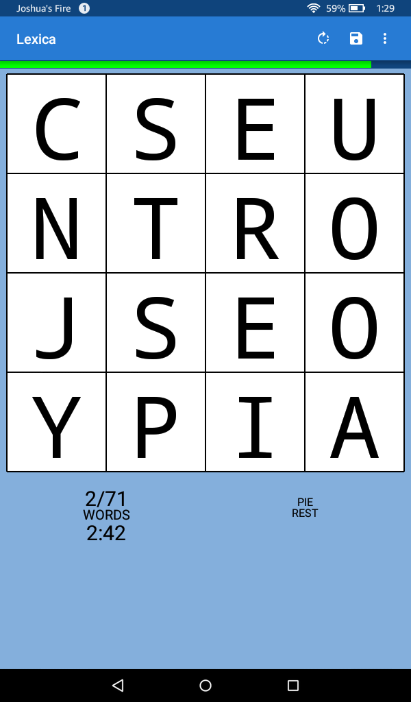 与 Boggle 类似,Lexica 让玩家与计时器赛跑,在字母网格中找到单词。通过从单词的第一个字母拖动到最后一个字母来选择单词。可以在任何方向(包括对角线)进行连接。为了改变难度,玩家可以从 4x4 网格或 5x5 网格中选择。时间限制也可以更改为 3 分钟、5 分钟、10 分钟、20 分钟或 30 分钟。此外,用于单词列表的词典可以设置为美式英语或英式英语。