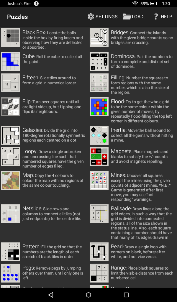 Puzzles 是不同益智游戏的大集合。总共有 39 个游戏,每个游戏都与其他游戏不同。其中一些游戏是流行的脑力游戏的通用版本,可以在印刷的谜题书中找到。数独以 Solo 的名称包含在内,KenKen 是 Keen,Nonograms 是 Pattern。扫雷 和其他流行的电脑益智游戏也包含在该应用程序中。这个应用程序提供了很多内容,因此益智游戏爱好者应该能够找到至少几个他们感兴趣的游戏。