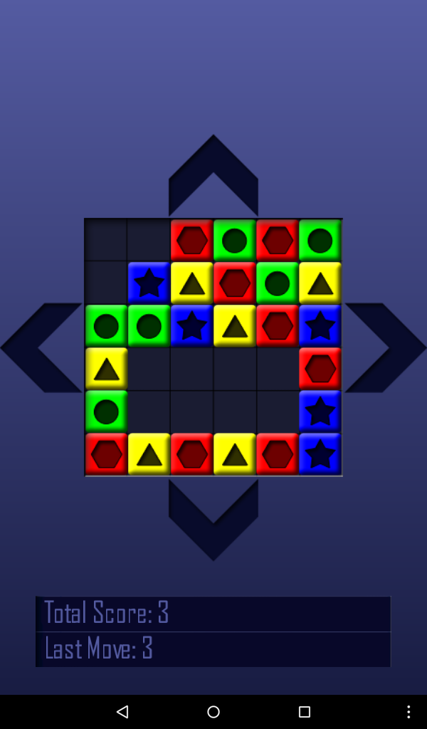 Shift 是一款益智游戏,玩家尝试通过连接三个相同颜色的方块来从 6x6 网格中移除彩色方块。游戏场地最初只有 6x6 网格的外边缘上有方块,玩家通过按下棋盘顶部、底部、左侧和右侧的四个箭头之一来移动棋子。按下其中一个按钮会导致棋子沿该方向滑动并开始填充网格中心。如果网格完全被棋子填满,游戏就结束了。