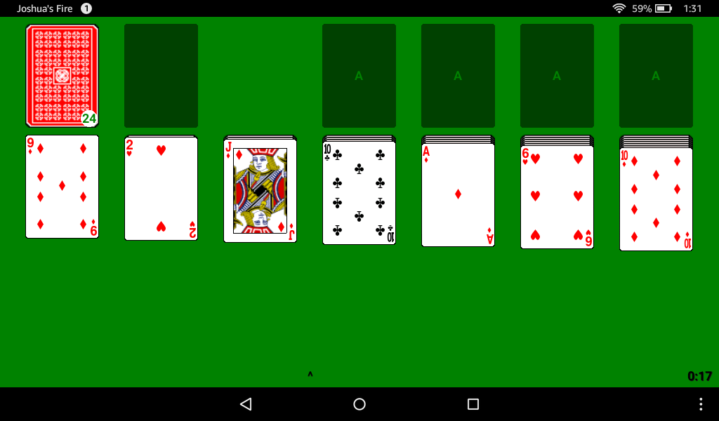 10 种不同单人纸牌游戏的集合。该应用程序包含标准的克朗代克和空当接龙游戏,以及贝克纸牌、黑寡妇、四十大盗、高尔夫、蜘蛛、狼蛛和三峰。某些游戏(例如克朗代克)具有一次抽一张牌或一次抽三张牌的变体。这些游戏在触摸屏上运行良好,但在较小的屏幕上可能会有点拥挤。可以选择使用大型卡片艺术,这使得很容易看到哪张卡片是哪张卡片,但实际上并没有改变卡片的大小。