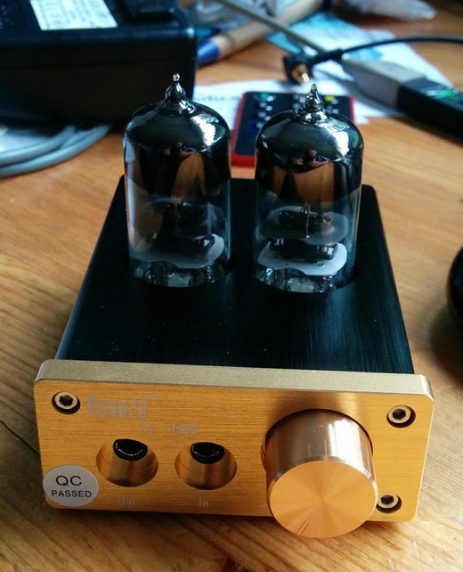 出于某种奇怪的原因,我无法以相同的名称订购相同的设备,而是发现香港的一家供应商在网上以 Douk Audio Hifi 6J9 的名称出售。供应商承诺该设备(包括运费)约为 45 美元,所以我订购了一台。它如期而至,现在正坐在我的数模转换器之上,为我的 AKG 耳机发出甜美的声音。显然,安装了两个 6J9 真空管,这款设备不适合放在笔记本电脑包里,但 AKG 设备无论如何都太大了,不适合携带。