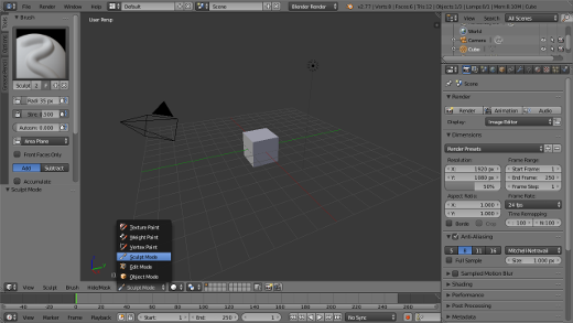 作为一个简单的例子,以 Blender 的默认场景为例,其中只有一个孤独的小立方体坐在空白空间中。选择立方体后,使用3D 视图标题中的模式选择菜单切换到雕刻模式。您应该在鼠标光标周围看到一个红色圆圈。这是你的雕刻笔刷。