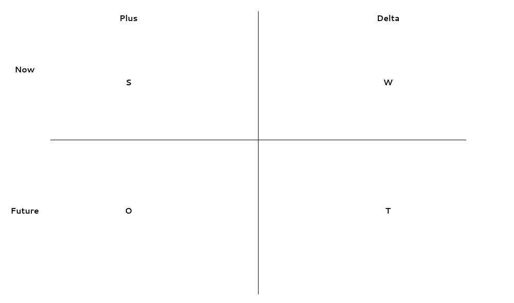 根据我的经验,不直接讨论 SWOT,而是从不同的方向入手会更容易。您可能熟悉“优点/缺点”(Plus/Delta)练习。在会议结束或活动结束后,您可能会讨论进展顺利的事情(优点)以及下次需要更改的事情(缺点)。我发现将这种语言与传统的 SWOT 项目规划方法相结合,可以带来更灵活和有效的结果。
