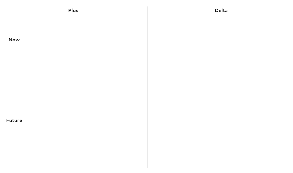 这是一个非常容易理解的网格。大多数人都可以谈论现在进展顺利的事情(现在-优点)以及我们应该在下个季度更改的事情(现在-缺点)。团队成员可以设想一年后团队的优势(未来-优点)以及我们应该在明年内更改哪些事情,以便它们不会成为未来的障碍(未来-缺点)。
