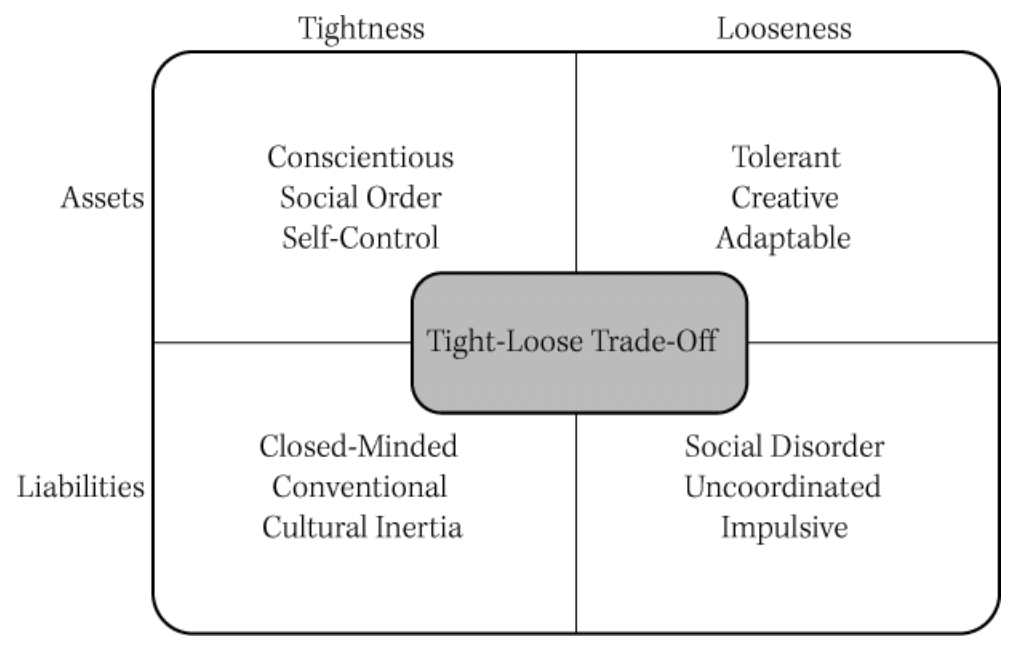 广义上讲,宽松文化往往是开放的,但它们也更加混乱。另一方面,严谨文化具有令人安心的秩序和可预测性,但它们的容忍度较低。这就是严谨-宽松的权衡:在一个领域的优势与另一个领域的缺点并存。